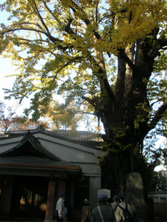 | 品川寺(ほんせんじ)境内にある江戸六地蔵の一つ「銅像造地蔵菩薩座像」 | 同境内にある樹齢600年の大イチョウが黄金色に染まっている |