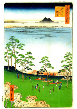 | 「飛鳥山北の眺望」絵:飛鳥山の花見風景と筑波山方向の眺め。 | 徳川吉宗が花見をした記念に建てられた「飛鳥山碑」。 |