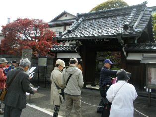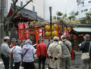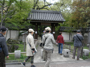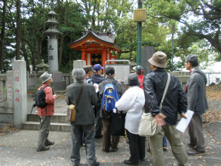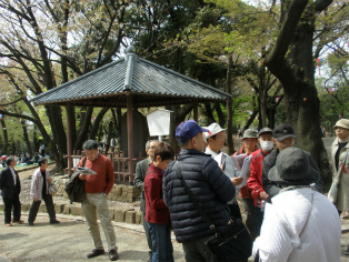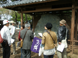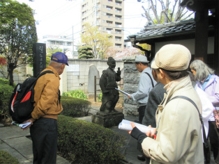 歌川広重が『名所江戸百景』で描いた場所とその周辺を歩く見学会の12回目が、4月12日(日)に行われ、JR線内の事故による大幅運休にもかかわらず、多くの方々が参加されました。今回は王子駅を起点として周辺を巡り、また王子駅に戻るという回遊コースです。当時の寺や神社が数多く残っており、石神井川(音無川・滝の川)による地形の変化が目に見える形で残されています。幸い好天に恵まれ、町歩きを存分に楽しむことができました。