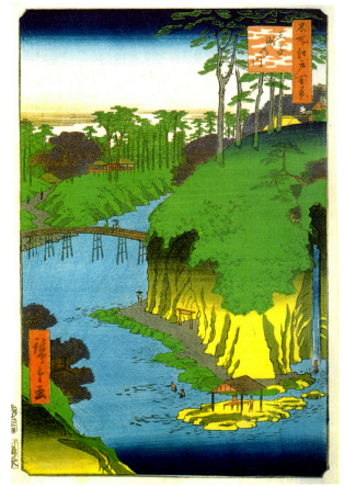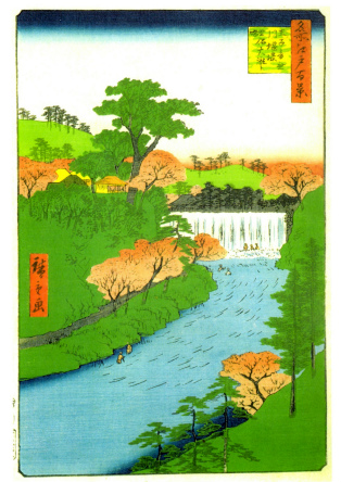 | 音無川堰埭のあったあたり(音無親水公園)を上から見下ろす。 | 「王子音無川堰埭 世俗大瀧ト唱」絵:大滝とも呼ばれた石神井川の堰(せき)のあたり。 |