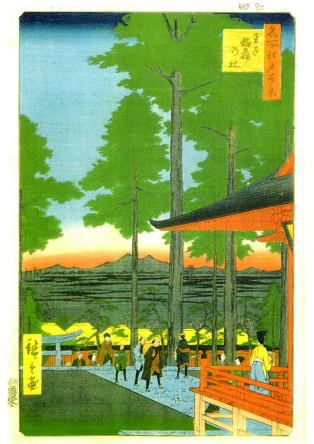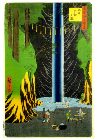 | 「王子不動之瀧」絵:涼をとるため滝浴(たきあみ)をしている様子。 | 熊野の若一(にゃくいち)王子を勧請して創建された王子神社。 |