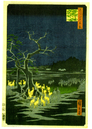 | 装束榎は明治中頃に枯れて現在の装束稲荷神社の場所に幹が移され、その跡継ぎの榎木が御神木となっている。 | 「王子装束ゑの木 大晦日の狐火」絵:大晦日に関八州の狐が大きな榎木(装束榎木)の下に集まり、装束に着替えて王子稲荷へ向かう。 |