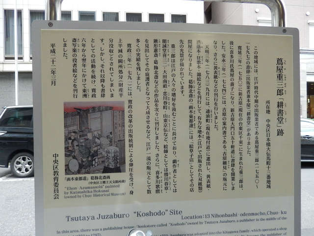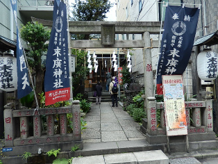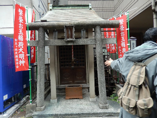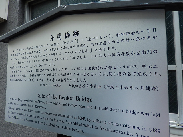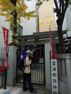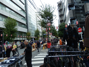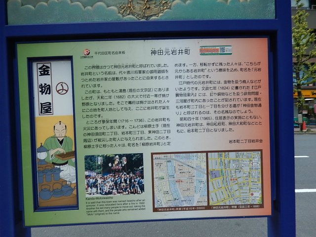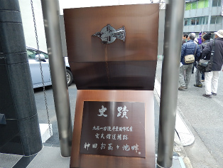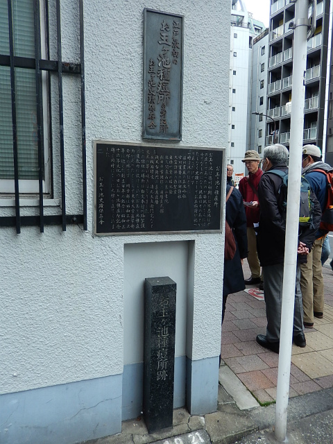 12月6日(日)、曇天の初冬の午後、和泉橋北詰広場から班毎に『江戸名所図会』の挿絵のうち5枚の跡をめぐりました。最初の挿絵「於玉ケ池古事」付近に着く前に寄り道、柳原(土手)通りの岩本町・東神田バザーをのぞき、江戸の古着市の雰囲気に浸ったあと、お玉ケ池跡、お玉ケ池種痘所跡など見学しました。次の「弁慶橋」は「藍染川」に架かっていた変形橋で、のち赤坂見附に移築されました(ただし、原形はとどめていません)。大伝馬町に向かい、挿絵「錦絵」の地本(じほん)問屋蔦屋(つたや)跡、大門通りを抜け、日本橋富沢町の富澤稲荷、旧吉原入口の大門跡地、末廣神社、最後に玄冶店(げんやだな)跡を見て東京メトロ人形町駅前で解散しました。
