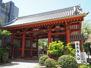 | 新緑の中にひっそりたたずむ宝泉寺。 | 渋谷氷川神社入口から参道を望む。 |