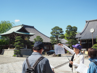 | 渋谷長谷寺境内で、挿絵の説明に耳を傾ける。 | 約10メートルもある十一面観世音菩薩像に心奪われる…。 |