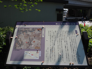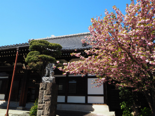 | 渋谷長谷寺法堂の横の八重桜が見頃を迎え、青空に映える♪ | 桜の花びらが彩を添える、青山高樹町由来の説明板。 |