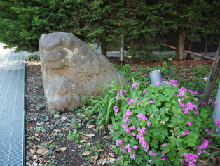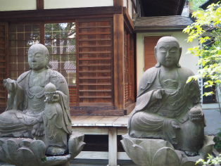| 豊栄稲荷神社の一隅には13基の庚申塔。 | 東福寺の丸彫り半迦のお地蔵さま。挿絵に載っている2体がそのままあるのに感動! |