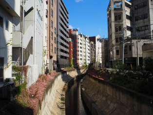 | 氷川橋から渋谷川を臨む。 | 明治通りの並木橋交差点を北上した所にある金王八幡宮。 |