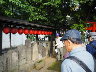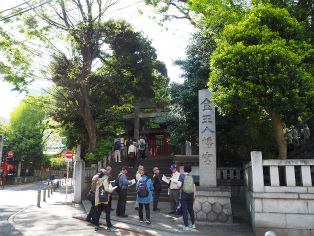 | 宮前坂上から六本木通りに下る道「金王坂」の説明を聞く。 | 宮前坂にある御嶽神社の説明を最後に解散!皆様、お疲れさまでした!! |