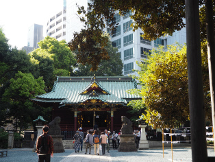 | 渋谷氷川神社本殿にて順番に参拝! | 広い境内には金王相撲が行われていた土俵も! |