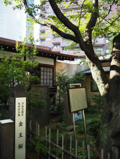 | 夕暮れ時の金王八幡宮の社殿。 | 社殿横にある金王桜。桜は残念ながら拝めず…。 |