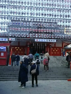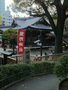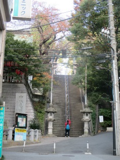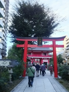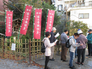 現在は防衛省になっている尾張家上屋敷跡の広大さに驚き、松平摂津守上屋敷跡では、幕末に数奇な運命をたどった容保(かたもり)、定敬(さだあき)ら高須四兄弟がここで生まれたという説明を感慨深く聞きました。東京は高低差が大きい地域が多いと思ってはいましたが、だらだらと上り坂が続くと思っていたら、いきなり崖のように急な階段が現れます。四ツ谷、市ヶ谷と、「谷」のつく地名に「なるほど」と思いました。新宿御苑を経て新宿の繁華街に入っていくと、思った通りのすごい人出。人混みの中をグループからはずれないようにと、「えど友」の紫色の旗から目をはなさないように歩きました。ビル街と思って歩いていると思いがけず出現する太宗寺、花園神社、成子天神。そして綿帽子の花嫁さんにも出会った熊野十二社。
