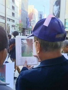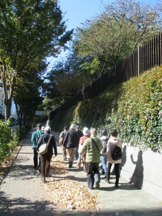 秋晴れの日曜日、正午を回るころJR市ヶ谷駅を出発。「市ヶ谷八幡」、「玉川堤の花」、「四ツ谷内藤新宿」、「角筈熊野十二社俗称十二そう」の4枚が描かれた地を巡りました。落ち葉が散り敷く舗道を10人前後のグループで歩き始めます。