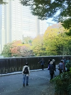 この時期ともなると、高いビルが林立する新宿では3時ころには夕暮れ間近のような陽射しになります。紅葉した木々が、傾いた陽の光を受けて輝くような新宿中央公園を通って、都営地下鉄大江戸線都庁駅前で4時ころ解散になりました。
