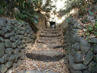 | 7世紀後半~8世紀に築造された横穴式古墳、等々力渓谷三号横穴。 | 渓谷入り口付近に架かるゴルフ橋。昭和初期に開発されたゴルフ場のために造られた。 |