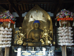 | 三仏堂のうち上品(じょうぼん)堂(右)と下品(げぼん)堂(左)。 | 上品堂の上品上生(じょうしょう)仏。 |