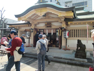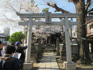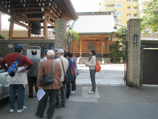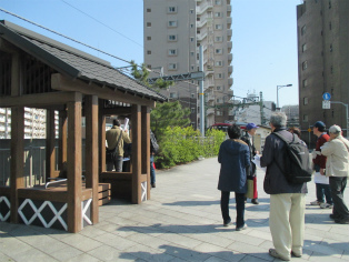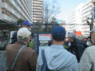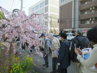 3月25日、都内の桜が満開となった晴天の日曜日、絶好の見学会日和でした。都営浅草線泉岳寺駅から京急新馬場まで歩きました。第一京浜国道歩道上の大きな石垣、高輪大木戸跡からスタートです。「高輪うしまち」は、牛を使って労役に携わった人たちの町、「忠臣蔵」のクライマックス泉岳寺は多くの人が訪れ、観光地そのものです。古い石鳥居がある高輪神社からさらに北上。国道の歩道脇に残されている石垣はここから先が海だった証しです。 「月の岬」、「品川御殿やま」は絵とは全く違う風景に変貌しています。旧東海道に入り、土蔵相模や洲崎弁天が描きこまれている絵「品川すさき」は、今も船宿が多く船溜まりになっています。菜の花と桜に見とれつつ旧街道の史跡を見ながら天王祭で有名な荏原神社を参拝して、15時30分頃解散となりました