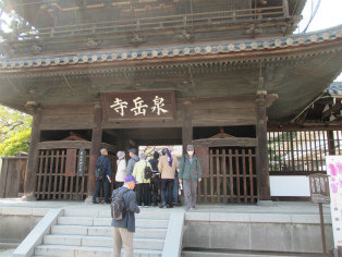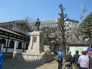 | 観光客で賑わう泉岳寺 | 泉岳寺山門脇の大石内蔵助像 |