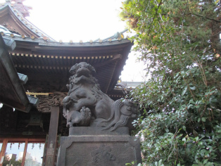 | 高輪神社の新しい拝殿と古い狛犬 | 高輪の由来を聞く |