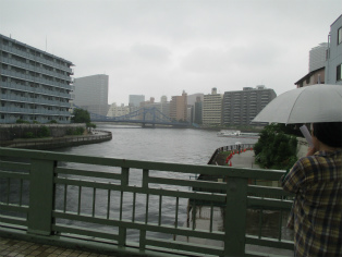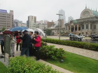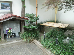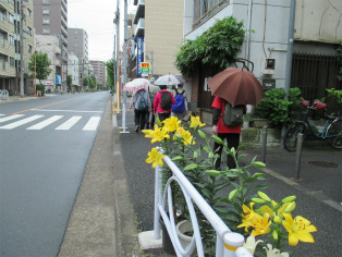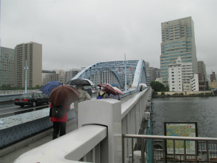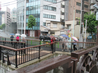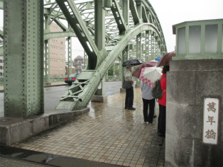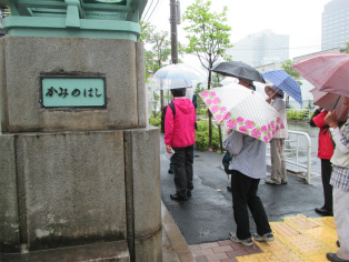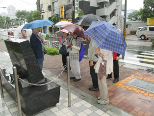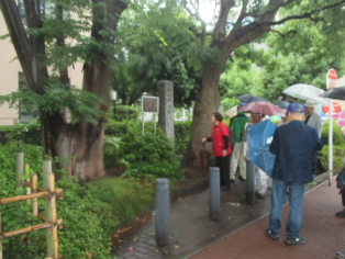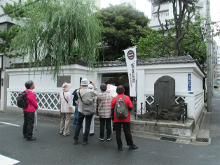 台風接近が伝えられる日曜日、歩く内に雨は本降りとなりましたが、参加者は約3時間の道のりを元気で歩き続けました。討ち入り当時とは川の流れも道筋も変わっていますが、ほぼ浪士たちが歩いたといわれる道をたどることができます。芥川龍之介文学碑や芭蕉稲荷など、今回のテーマと外れる史跡にも立ち寄りますが、忠臣蔵の様々なエピソードを聞きながら、それぞれのポイントで浪士たちの心情に思いを馳せました。見学会後半(12月開催予定)の出発点となる歌舞伎座前で解散しました。