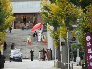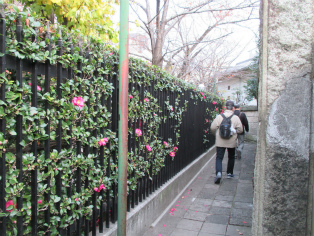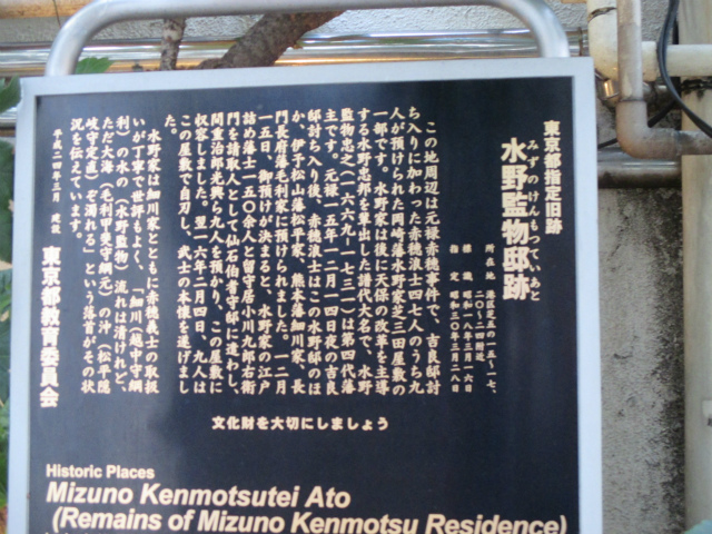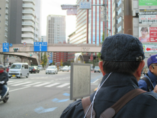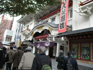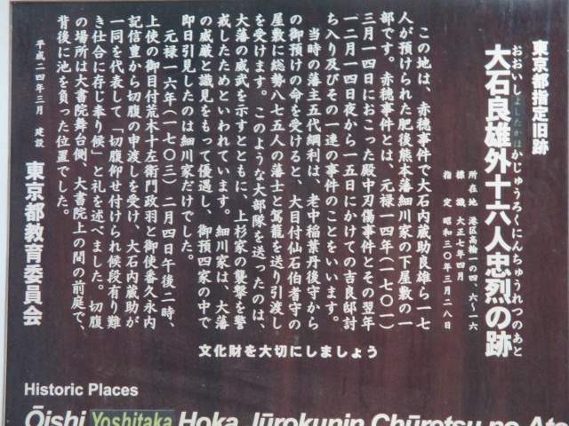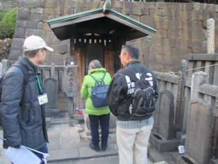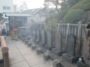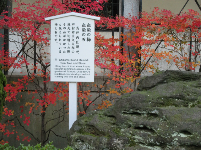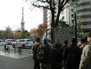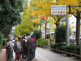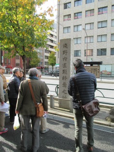 寒さが本格化した12月9日(日)、曇り空の中を東銀座・歌舞伎座前に集合して、終着地泉岳寺を目指して出発しました。銀杏が美しく色づいた昭和通りや京浜国道など、歩いたのはほとんどが道幅の広い道路でした。ビルが立ち並ぶ都心とはいっても、日曜日でもあり繁華街を通らなかったため、のんびりとした散歩コースです。新橋の田村右京太夫邸跡では、「浅野内匠頭終焉の地」の石碑が立っていました。日比谷通りの歩道上にあれほど大きな石碑があるとはびっくりしました。この時期、映画やテレビで数々の忠臣蔵のエピソードが語られますが、今回の行程にもいくつかありました。泉岳寺近くの細川越中守邸跡では切腹の座(「大石良雄外十六人忠烈の跡」)がそのまま残されており、ここにお預けになった浪士たちが厚遇されたことなど、臨場感あふれる紹介がありました。そして時節柄たくさんの人が訪れている泉岳寺で、線香の煙が漂う墓所を巡り、約3時間半の行程を終了しました。