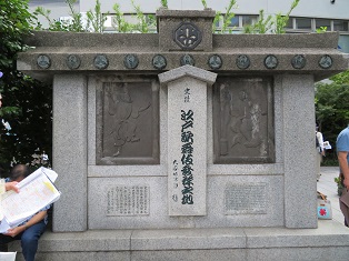 | 泰明小学校前の「島崎藤村・北村透谷 幼き日 こゝに学ぶ」の石碑 | 銀座四丁目の宝童稲荷 |