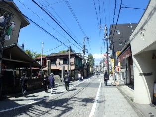 | 京浜急行青物横丁駅の改札出口階段下に集合した。 | 旧東海道を日本橋方面へ。道幅は、江戸時代から変わっていない。 |