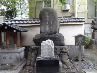 | 萬年橋から見た小名木川と隅田川の合流地点。「深川萬年橋」絵に描かれた辺り。 | 芭蕉愛好の石蛙を祀った芭蕉稲荷神社。 |