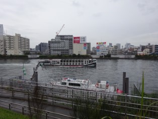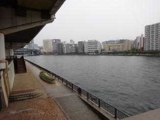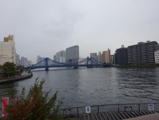 | 「大はしあたけの夕立」絵。対岸には幕府の「御船蔵」が描かれている。 | 当時の新大橋が架かっていた辺りを水上バスが通る。 |