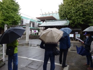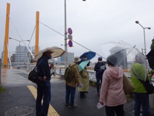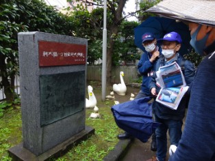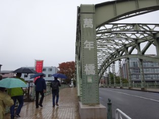 10月31日(日)、両国駅西口に集合後、両国から深川方面を歩きました。今回取り上げる『名所江戸百景』の絵は全て隅田川沿いを描いています。そのため、コースも両国橋・新大橋・清洲橋・萬年橋といった橋を巡るものとなっています。あいにく雨が降り通しでしたが、史跡の散策を楽しんで清澄庭園で解散となりました。