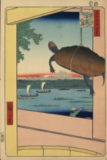 | 萬年橋を渡る。 | 「深川萬年橋」絵。手桶に吊された亀の表情が良い。 |