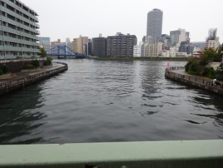 | 「みつまたわかれの淵」絵。中州の辺りを荷船が行き交う。 | 芭蕉庵史跡展望庭園からの清洲橋方面の眺め。「みつまたわかれの淵」絵に描かれた辺り。 |