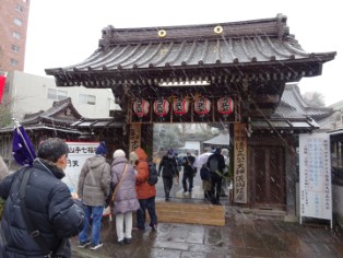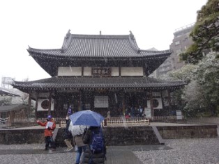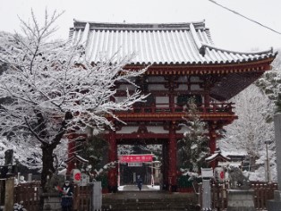 | 仁王門の近くには、平井権八と遊女小紫にちなむ比翼塚がある。 | 雪化粧した仁王門は、まるで風景版画のような美しさ。 |