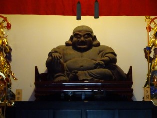 | 堂内に祀られている布袋尊。 | 木魚の原型である魚板が吊り下げられている。 |