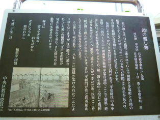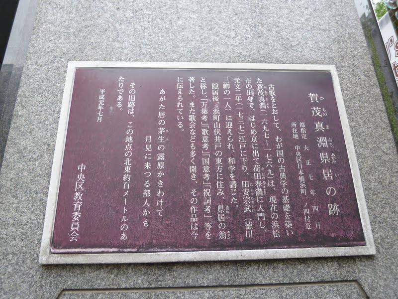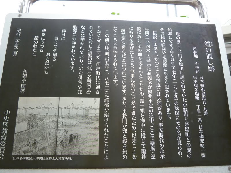 | 所要時間:見学時間を除いて約1時間30分 都営地下鉄新宿線・浜町駅A2出口(5分)賀茂真淵翁閑居地説明板(10分)新大橋(7分)旧新大橋跡石碑(3分)芭蕉稲荷・萬年橋(3分)旧新大橋跡石碑(30分)江戸橋(4分)兜神社・兜岩(3分)鎧の渡し跡説明板(3分)永田馬場山王旅所・薬師堂・其角住居跡石碑(15分)伊雑(いそべ)太神宮(4分)三ツ橋(弾正橋) |