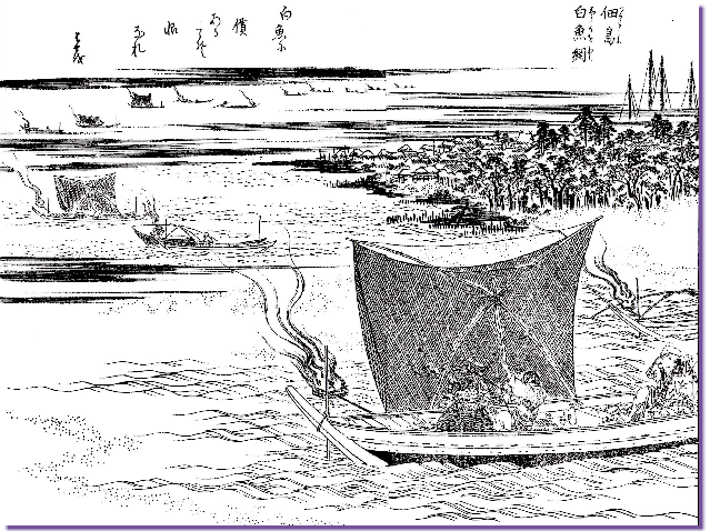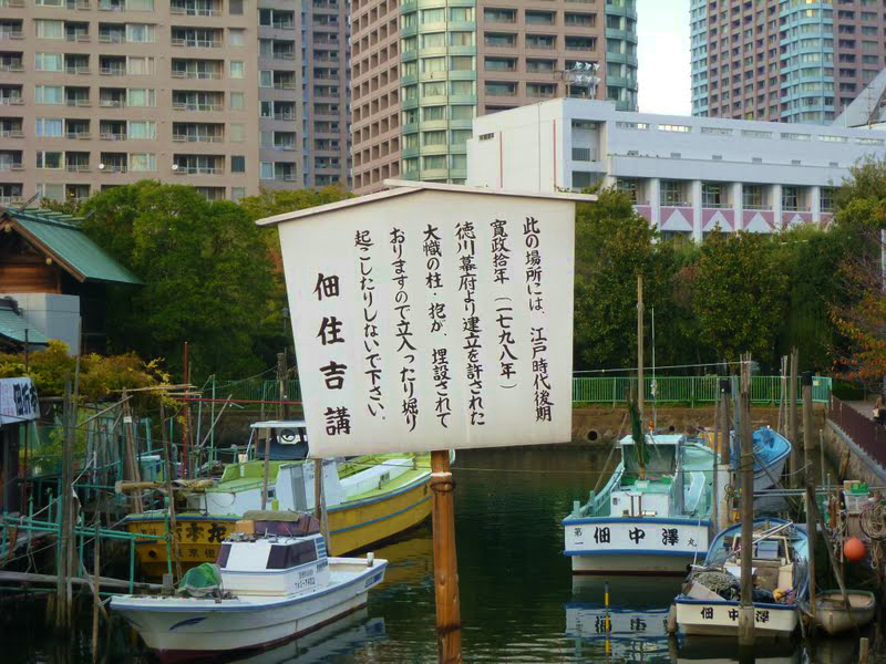 | 本殿脇から抜けて赤い佃小橋を渡って石川島へ向かう。堀の中になにやら立て札が・・・ |
