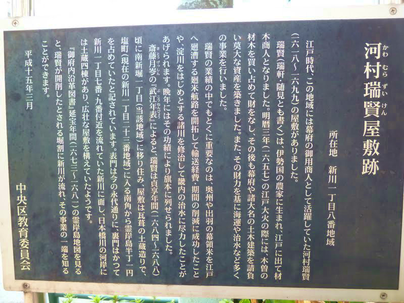 霊岸橋を渡って永代通りを横切り少し行ったところに、河村瑞賢屋敷跡の説明板。ホテル・ヴィラフォンテーヌの前にある植え込みに立っている。(写真選択→拡大) |
