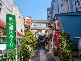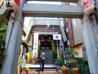 | はじめて訪れた烏森神社。細い参道の脇は一杯飲み屋がずらりで、さすが、新橋といったところか。 | 本殿はそれらしき工夫をしたコンクリート製。 |