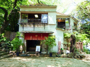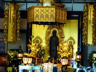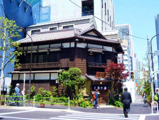 | 烏森神社の前の通りは稲荷小路と呼ばれていた。この通りと、愛宕下通りとの交差点でひときわ異彩を放つこの日本家屋が、大坂屋砂場である。 | ビルのような真福寺の本尊、瑠璃光薬師。本堂の扉は押しても引いても開かず、人気もない。ガラス越しに撮影する。 |