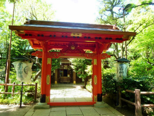 | まぶしい新緑。境内にはさわさわと気持ちの良い風が吹き渡っていた。 | 丹塗りの門。夏越しの払いの時はここに茅の輪をかけるとか。 |