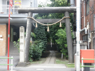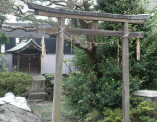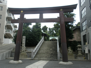 | 鷺森神明宮の跡と思われる鳥居と祠。 | 白金氷川神社の鳥居。 |
