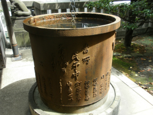 | 六本木ヒルズのそばにある櫻田神社の鳥居。 | 境内にある天水桶。文政9年(1826)に奉納されたもの。 |
