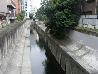挿絵の橋と思われる新橋から見た現在の渋谷川の様子。 |