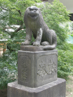 | 天現寺の毘沙門堂。「毘沙門天王」の石碑が建っている。 | 堂の前にある虎石像が睨みをきかせている。 |