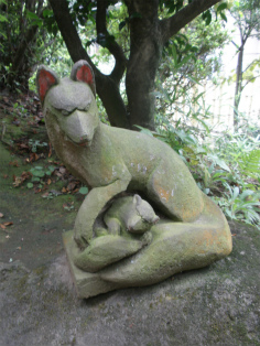| 本殿横の稲荷神社の石段に置かれている親子狐。 微笑ましい姿をしている。 | 松秀寺山門。門前には「日限(ひきり)地蔵尊」の石碑がある。 |