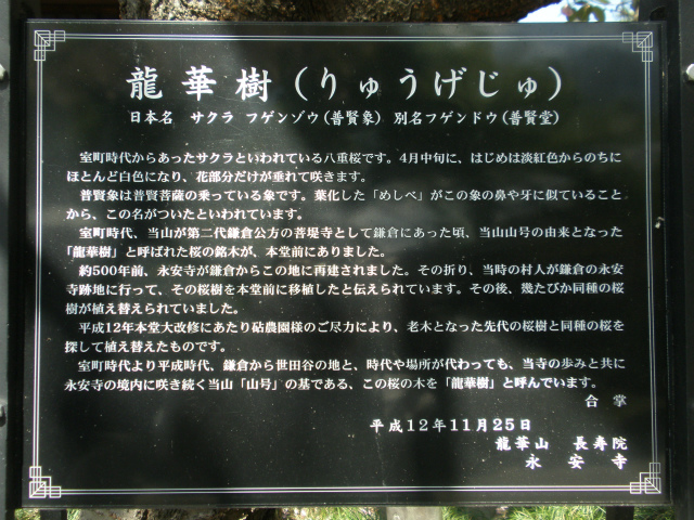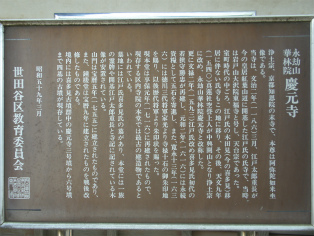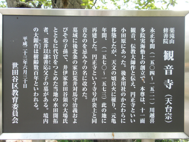 | 所要時間: 歩く時間と見学時間を入れて全行程3時間ほど。 大井町線・田園都市線二子玉川駅-バス-永安寺前バス停-3分-龍華山永安寺-3分-大蔵氷川神社(氷川明神社)-1分-帯刀先生義賢の墓-6分-鎌田山(東覚山)吉祥院-12分-玉川山(長立山)常光寺-3分-観音寺-12分-永劫山慶元寺-2分-喜多見氷川神社(氷川明神社)-10分-喜多見公園バス停-バス-二子玉川駅 (括弧内は江戸名所図会の項目名) |
