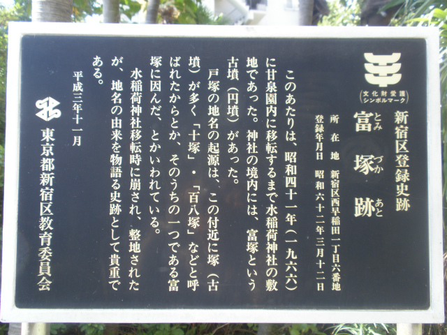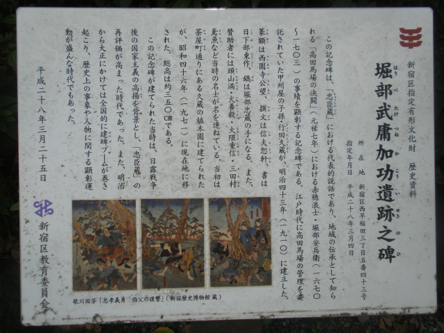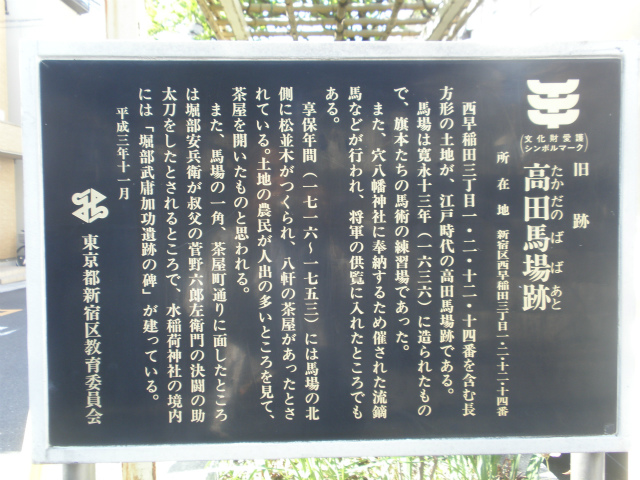 | 所要時間: 歩く時間と見学時間を入れて全行程3時間ほど。 東京メトロ東西線早稲田駅-3分-穴八幡宮(高田八幡宮)-5分-富塚跡-6分-禅英山宝泉寺-10分-戸山公園(和田戸山)-10分-箱根山-15分-荒井山公園(荒藺山)-5分-高田馬場跡-3分-堀部安兵衛の碑-1分-高田富士-1分-甘泉園公園(三島山)-2分-水稲荷神社(高田稲荷明神社)-5分-如意山亮朝院(高田七面堂)-3分-都電荒川線面影橋停留場 (カッコ内は図会の見出し項目名) |