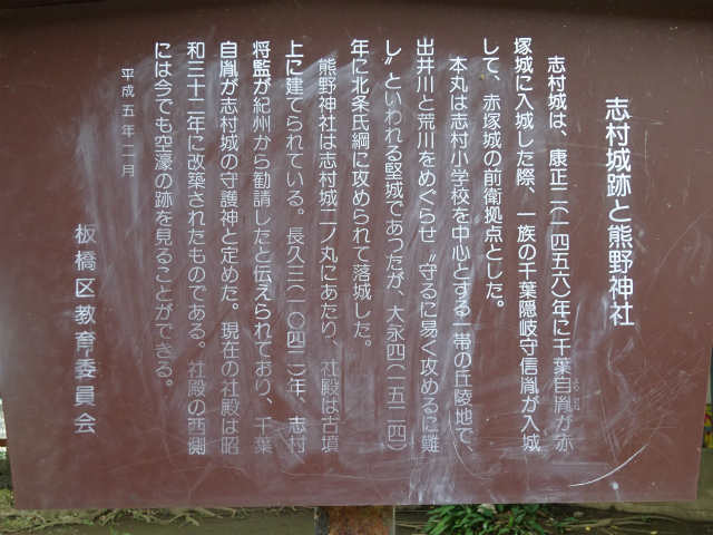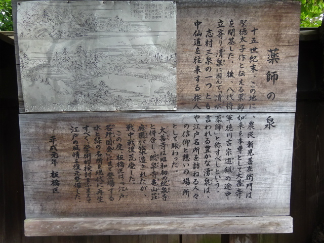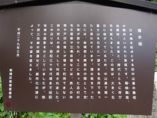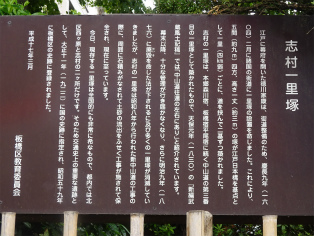 | 所要時間: 歩く時間と見学時間を入れて全行程3時間ほど。 都営三田線志村坂上駅-1分-志村一里塚-3分-旧中山道-2分-大山道道標・庚申塔-1分-清水坂-3分-薬師の泉庭園(大善寺跡)-3分-総泉寺 (清水薬師如来)-8分-清水坂下-10分-志村熊野神社(熊野権現の宮)・志村城跡(千葉家の城址)-25分-西台公園-5分-西台山円福寺-25分-都営三田線西台駅 |