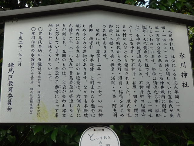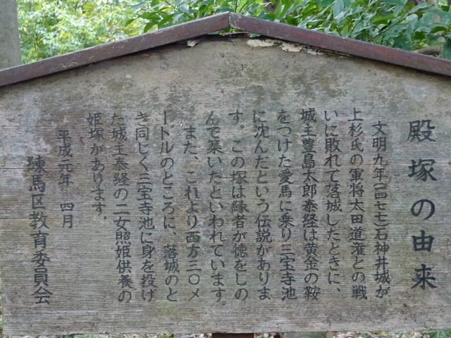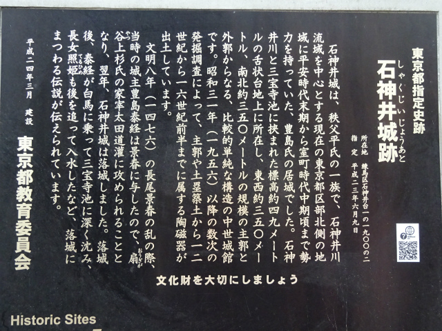 | 所要時間: 歩く時間と見学時間を入れて全行程3時間30分ほど。 西武池袋線練馬高野台駅-5分-東高野山長命寺(谷原山長命密寺)-20分-石神井公園-10分-池淵史跡公園-6分-豊島山道場寺-2分-亀頂山三宝寺-4分-石神井氷川神社(氷川明神祠)-1分-石神井城跡(石神井の城址)-2分-三宝寺池(三宝寺の池)-4分-厳島神社(弁天堂)-8分-姫塚(照日塚)-1分-殿塚-30分-石神井神社(石神井明神祠)-10分-西武池袋線石神井公園駅 |