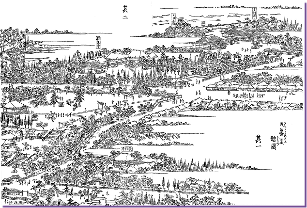 これが船つなぎ松の碑。元は境内のてっぺん(現西日暮里公園)にあって、船人の目印になっていた松が図会の挿絵に描かれている。 |